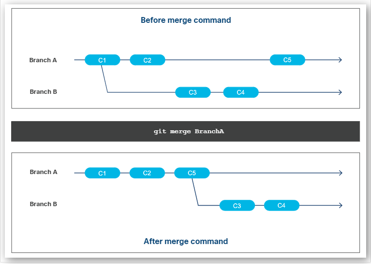 - Git applies the commits from the source branch to the target branch.