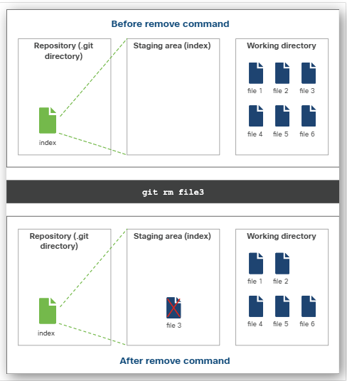 The git rm command removes files both the working directory and staging area. It stages the change for the next commit.